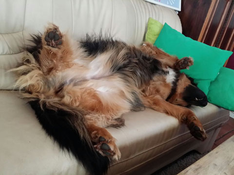 so Benny, jetzt zu dir. Wenn ich gleich zurückkomme, dann sitzt du auf der Couch grinst glücklich vor dich hin und kuschelst mit Frauchens Kissen.