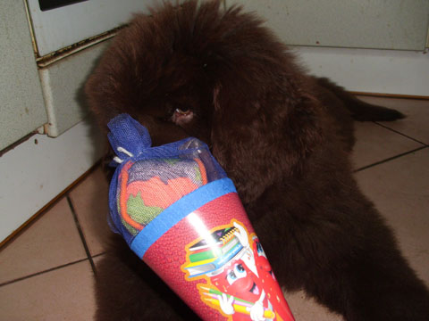 Hoho........ lecker, lecker. Meine eigene Schultüte. Ich bin nämlich jetzt ein großer Neufibär. Ich geh jetzt zur Schule. Zur Welpenschule und da soll ich jetzt ganz viel lernen. Hehe..... die wissen wohl nicht wer und was ich bin. Ich bin ein Neufibär und ich werde nicht erzogen.....ich erziehe!!!!! Aber das werden die schon noch begreifen.